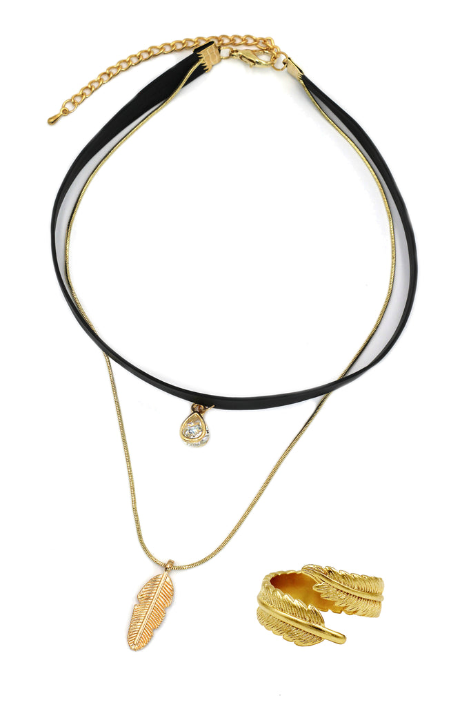 Fashion double chain feather pendant choker ring set