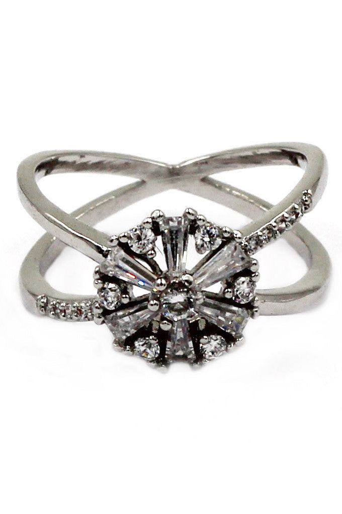 Elegant crystal cross open silver ring